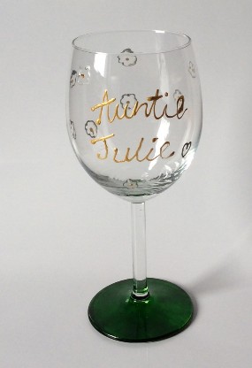 Personalised glassBase is painted green with writing and decorative marks.from £5.00